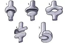 - Dans une articulation toroïde ou à emboîtement réciproque ou en selle, une surface est convexe dans un sens et l'autre surface est concave également, mais dans le sens perpendiculaire, seuls les mouvements d'opposition sont permis (c'est le cas de l'articulation trapézo-métacarpienne du pouce permettant le mouvement d'opposition des doigts ainsi que la pronation).