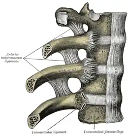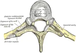 Articulation costo-vertébrale, vue de face, ligament intra-articulaire en bas à gauche.