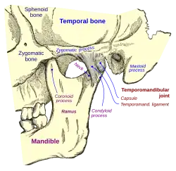 La pathologie de l'articulation temporo-mandibulaire se traduit par des douleurs musculaires (myalgies), des craquements, des ressauts à l'ouverture et à la fermeture. Sa proximité de l'oreille peut engendrer des acouphènes, des otalgies, de l'hyperacousie, des sensations de vertige ou d'oreille bouchée[1].