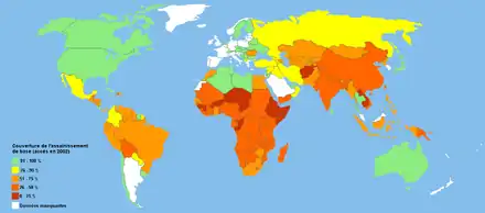 La couverture mondiale de l'assainissement de base montrée sur la carte ci-dessus provient d'une estimation effectuée par le Water & Sanitation Program en 2002 (branche de la Banque mondiale) en utilisant différentes sources. Dans ce contexte, l'« assainissement de base » correspondant à l'accès à « un système d'évacuation des excreta amélioré »[13], ce qui inclut les connexions à un système d'égout, à une fosse septique, à une latrine à siphon hydraulique, à fosse simple ou à fosse améliorée ventilée. En revanche, ne font pas partie des systèmes « améliorés » les latrines publiques ou partagées, les latrines à ciel ouvert (cas de nombreuses latrines à fosse simple), les latrines à seau et bien évidemment la défécation en plein air, en sachet plastique, etc. (voir l'article Latrine pour plus de détails).