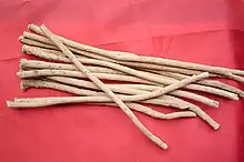 Pour fabriquer cette poudre, on commence par passer au four à température modérée les fines lamelles de racine pendant une heure puis on met celles-ci dans un moulin broyeur, jusqu’à obtention d’une très fine poudre.