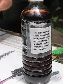 - tanins : notamment ceux présents dans le vin ou sous forme d'acide tannique, issus du raisin. Ainsi que les tanins des boissons (vin, bière, whisky, ...), élevées en fût issu des bois comme le chêne, le charme, l'écorce de nombreux arbres, dont par exemple le frêne ou le peuplier.