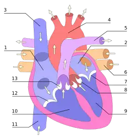 Le sang pauvre en oxygène est apporté à l'atrium droit par les veines caves. Le sang oxygéné est apporté des poumons à l'atrium gauche par les veines pulmonaires.