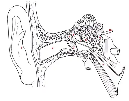 - Les sons captés par le pavillon auriculaire pénètrent dans le conduit auditif externe. Ces ondes mettent en vibration le tympan (énergie mécanique) dans l’oreille moyenne. Les osselets (marteau, enclume, étrier) transmettent cette énergie et adaptent son impédance acoustique, pour éviter la perte d'énergie liée au passage du milieu aérien au milieu liquidien. L’étrier est en contact avec la fenêtre ovale, point d'entrée dans l’oreille interne.
