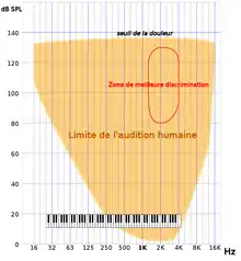 - Le domaine des fréquences sonores perceptibles s'étend, dans les meilleurs cas, de 16 Hz (son grave) à environ 16 000 Hz (son aigu) (Chouard 2001, p. 87). La discrimination entre deux fréquences voisines est bonne jusqu'à environ 4 000 Hz[1]. La musique occidentale s'est surtout préoccupée de cette perception, et l'appelle hauteur d'un son.