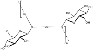 La liaison soufre–or n'est pas ionique. On pense que l'aurothioglucose en solution aqueuse forme un polymère dans lequel les atomes d'or relient les unités thioglucose[3] :