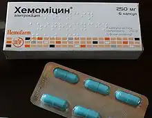 | Forme | comprimé pelliculé à 250, 500 et 600 mg, poudre pour préparation de solution buvable à 40 mg·ml-1 et à 200 mg/5 ml, poudre granulée en sachets de 100 et 300 mg, collyre à 15 mg·g-1, poudre pour préparation de solution injectable IV à 500 mg/10 ml |