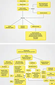 - ↑ (en) Robert I. McLachlan et Moira K. O'Bryan, « Clinical Review: State of the art for genetic testing of infertile men », Journal of Clinical Endocrinology and Metabolism, vol. 95, no 3, , p. 1013–24 (PMID 20089613, DOI 10.1210/jc.2009-1925).
