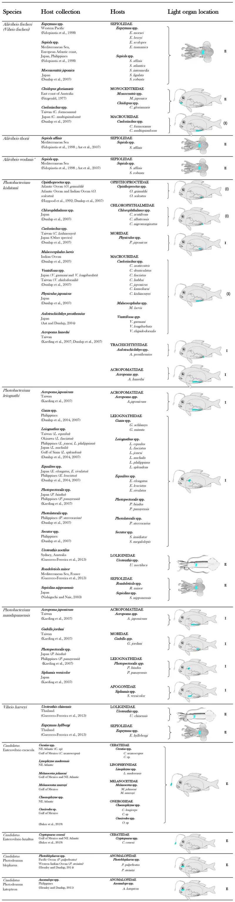 | Dans le tableau ci-dessous, les images de droite indiquent en bleu les emplacements de l'organe lumineux des différentes familles de poissons et de calmars symbiotiquement lumineux[41]. E indique une expulsion externe des bactéries bioluminescentes directement dans l'eau de mer. I indique une expulsion interne des bactéries bioluminescentes dans le tube digestif. (E) ou (I) indiquent une localisation supposée de l’expulsion. |