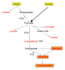 Les bactéries lactiques sont à la base de la fabrication de fromages, de yaourts et de laits fermentés. Dans l'industrie laitière, l'acide citrique présent dans le lait est considéré comme le principal précurseur de la formation des composés aromatiques appréciés comme l'acétate, l'acétoïne (odeur de beurre) et le diacétyle (odeur de fromage). Par contre, lorsque le diacétyle est produit à haute concentration dans la fermentation du vin, de la bière ou des saucissons (par Lactobacillus plantarum et Oenococcus oeni), il est à l'origine d'altérations organoleptiques[8].