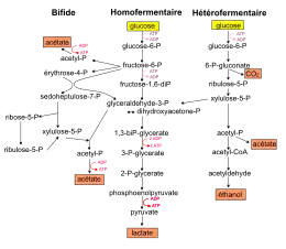 - La voie fermentaire bifide (ou voie de la fructose-6-P phosphocétolase FPC) est la voie empruntée par les bactéries du genre Bifidobacterium. Pour une molécule d'hexose consommée, cette voie produit 1,5 molécule d'acétate et 2,5 molécules d'ATP.