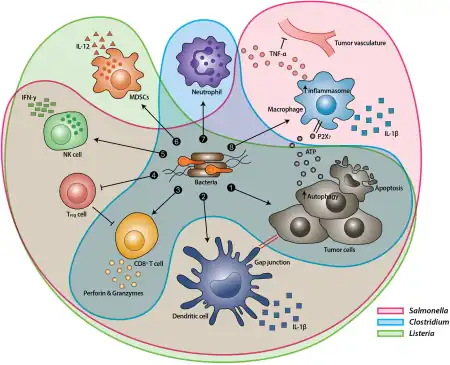 - La bactérie Salmonella tue les cellules tumorales par multiplication bactérienne incontrôlée qui peut conduire à l'éclatement des cellules cancéreuses. De plus, les macrophages et les cellules dendritiques (type de globules blancs) de ces tumeurs colonisées par Salmonella sécrètent de l'interleukine IL-1β, une protéine responsable de l'activité anti-tumorale[10].