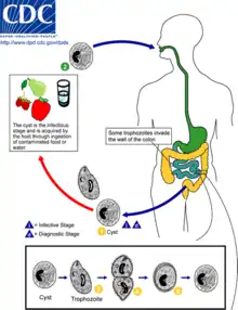 La forme végétative issue de ces kystes s'installe sur la muqueuse du gros intestin, de l'ampoule rectale à la portion terminale de l'intestin grêle ; elle y vit d'abord en surface, en commensal, se nourrissant du microbiote qui l'entoure, puis, ayant acquis un pouvoir histolytique, elle s'attaque à la muqueuse, au même titre que la forme histolytica de l'amibe dysentérique.