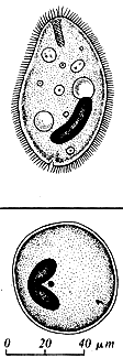 - le macronoyau (macronucleus) réniforme (ou noyau végétatif), servant aux fonctions végétatives ;