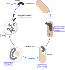 Bdellovibrio utilise des hydrolases pour casser les molécules de sa cellule-hôte, pour s'allonger et former un filament. Quand les nutriments de l'hôte sont épuisés, les filaments se séparent pour former la « progéniture » de Bdellovibrio. Ces derniers deviennent mobiles avant de provoquer la lyse de la cellule et de se disperser dans l'environnement. Le cycle de vie complet se déroule en trois heures. Il produit de 3 à 6 cellules-filles en moyenne pour une seule E. coli et jusqu'à 90 pour des proies plus grosses telles que les E. coli filamenteuses[3].