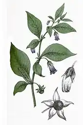 La Belladone (Atropa belladonna) est une plante herbacée vivace de la famille des Solanacées. Elle est parfois désignée par divers noms vernaculaires : « belle cerise », « belle-dame », « bouton noir », « cerise du diable », « cerise empoisonnée », « guigne de côte », « herbe empoisonnée », « mandragore baccifère », « morelle furieuse », « morelle marine », « morelle perverse » ou encore « permenton »[1],[2].