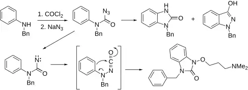 Une synthèse alternative intéressante de cette substance commence par une réaction séquentielle de la N- benzylaniline avec du phosgène, puis avec de l'azide de sodium pour produire l'azide de carbonyle correspondant. Lors du chauffage, de l'azote est dégagé et un mélange séparable de produit d'insertion de nitrène et du kétoindazole souhaité en résulte. Cette dernière réaction semble être un produit de type réarrangement de Curtius pour produire un N-isocyanate #, qui se cyclise ensuite. L'alkylation de l'énol avec du méthylate de sodium et du chlorure de 3-diméthylaminopropyle donne la benzydamine.