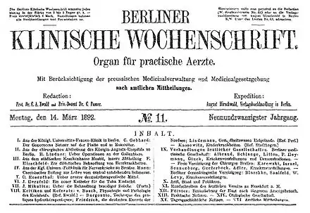 Fondé en 1864 par L.C. Posner, L. Waldenburg et C.A. Ewald, le Berliner klinische Wochenschrift disparaît sous ce titre en 1922, par fusion avec la revue Therapeutische Monatsheft pour prendre le nom de Klinische Wochenschrift[N 1]. De nombreux articles originaux et fondateurs en médecine ont été publiés dans le Berliner klinische Wochenschrift.
