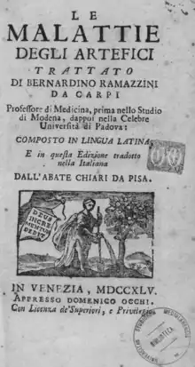 Bernardino Ramazzini (1633, Carpi – 1714, Padoue), professeur de médecine à Padoue, est un des précurseurs concernant les accidents du travail et précisa certaines mesures d'hygiène et de sécurité. Il est souvent décrit comme le précurseur d'une médecine du travail inventée au XIXe siècle. En 1700, Ramazzini, médecin à l'université de Modène, publie à Padoue son monumental De morbis artificum diatriba (Traité des maladies des artisans), encore réédité et qui, pendant deux siècles, servira de référence. Il fut traduit en français, commenté et enrichi par Antoine-François Fourcroy en 1777.