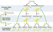 La bile[3] est un liquide organique sécrété et recyclé par le foie.