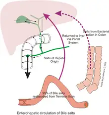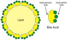 Les sels biliaires forment aussi des micelles microscopiques hydrosolubles, c'est-à-dire des micro-amas de lipides dégradés de 3 à 6 nm[réf. nécessaire]. La formation de micelles est essentielle à l'absorption des produits finaux d'hydrolyse des graisses (après leur dégradation par les lipases pancréatiques) à travers la membrane de la muqueuse intestinale, vers le sang. C'est notamment le cas des acides gras, des monoglycérides et aussi du cholestérol (qu'il soit d'origine alimentaire ou qu'il provienne du foie). Il existe une circulation entérohépatique des sels biliaires : c'est le cycle biliaire de Schiff.