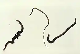 Schistosoma mansoni, mâle et femelle à gauche, femelle seule au milieu, mâle à droite.