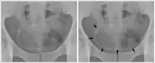 La calcification de la paroi de la vessie sur une radiographie du bassin, chez un homme subsaharien de 44 ans. Ceci est dû à une schistosomiase urinaire.