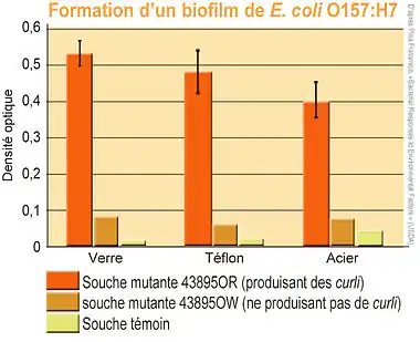 Les espèces les mieux étudiées (parce que certaines souches en sont très pathogènes) sont Escherichia coli et Salmonella enterica. Des souches chlororésistantes et capables de produire des biofilms sur des substrats lisses (inox ou verre) et même antiadhésif (Téflon) présentant des similitudes ont été trouvées et cultivées pour ces deux espèces[24]. Ainsi le sérovar de salmonelle Typhimurium - souche 43895OR, et les souches les plus résistantes de E.coli (ex. : E.coli 43895OR) produisent toutes les deux des colonies bactériennes solidement consolidées par une matrice extracellulaire contenant des fibres de type curli (et cellulose dans le cas de la salmonelle), que ce soit en culture sur de l'agar-agar, ou sur un substrat très lisse.