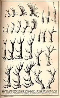 La comparaison entre les espèces révèle qu’il y a une relation allométrique positive entre la taille des bois et la taille de l’animal[8]. Les espèces de petites tailles ont des bois simples et petits, tandis que les plus grandes espèces ont proportionnellement des bois ramifiés plus gros.