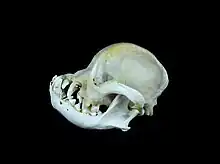 Crâne d'un chien brachycéphale. Le crâne est ici particulièrement arrondi, la machoire prognathe tandis que l'avancée du nez par rapport au crâne est presque inexistante.