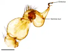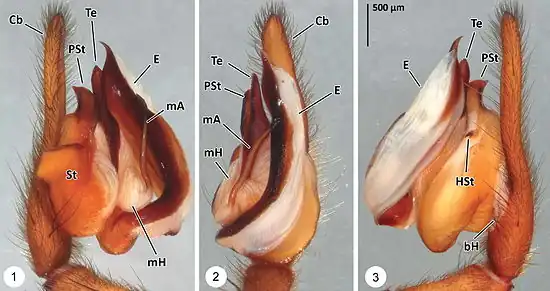 Les spécialistes des araignées (arachnologistes) ont développé une terminologie détaillée pour décrire les bulbes copulateurs, en commençant par l'extrémité la plus proche de la tête[c 2],[b 1],[1] :