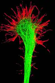 L'extrémité du cône de croissance est composée de feuillets membranaires aplatis, les lamellipodes desquels partent les filopodes, de fins prolongements contenant des microfilaments d'actine et de myosine, qui s'allongent puis se rétractent rythmiquement[1],[8].