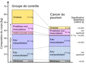 Au contraire de l'anorexie, où la masse corporelle hors graisse (masse maigre) reste largement conservée, dans la cachexie cancéreuse, la musculature squelettique est aussi diminuée. Jusqu'à 80 % du tissu gras et de la musculature squelettique peuvent disparaître. Par exemple, chez les patients atteints de cancer du poumon, qui ont perdu 30 % de la masse initiale de leur corps à cause de la maladie, la perte de poids provient d'une réduction de 85 % de la graisse et de 75 % des protéines des muscles squelettiques[27].