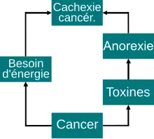 Pendant longtemps, on est parti de l'hypothèse que la sous-alimentation et la perte de poids chez beaucoup de patients du cancer étaient les conséquences de la seule perte de l'appétit (anorexie)[78]. La perte de l'appétit peut être due à des obstructions (resserrements, occlusions) du tube digestif dues à la tumeur, des douleurs, des effets secondaires de la thérapie du cancer, des nausées ou des modifications du sens du goût. Comme l'anorexie peut survenir chez les patients cancéreux aussi en l'absence de ces symptômes, ou après leur traitement, on suppose que des modifications provoquées par la tumeur peuvent provoquer la perte d'appétit[79]. L'indice de masse corporelle (IMC) des malades cancéreux est corrélé comme chez les individus sains avec la concentration de leptine. C'est-à-dire que pour une grande valeur de l'IMC, on mesure une grande concentration de leptine dans le sérum. La leptine est une substance sémiochimique importante, produite par les adipocytes, qui limite la survenance de la sensation de faim. Certaines cytokines peuvent influencer la production de leptine dans les adipocytes. Chez les patients cancéreux dans un stade avancé, la concentration dans le sérum de la cytokine interleukine 6 (IL6) est significativement augmentée, ce qui conduit chez les patients concernés à une diminution du niveau de leptine dans le sang. Le taux de létalité chez les patients avec de hautes concentrations en IL6 et par suite des taux de leptine particulièrement bas, est significativement augmenté[80],[81]. À côté de la modification de la production de leptine, l'activité de l'enzyme Acide gras synthase (FAS, acronyme anglais)[82] et de celle l'hormone mélanotrope (MSH)[83] jouent apparemment un rôle important dans l'anorexie[79].