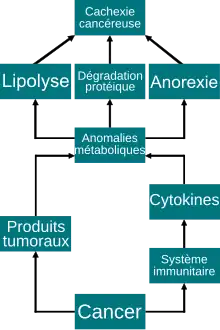 La cachexie cancéreuse implique un état inflammatoire chronique — semblable à celui d'une infection, d'une inflammation ou d'une blessure dans un tissu. Ce sont diverses cytokines inflammatoires, des prostaglandines, et de facteurs surexprimés par les cellules cancéreuses elles-mêmes. Toutes ces substances interviennent directement dans les circuits régulateurs périphériques et centraux de la prise de nourriture et du métabolisme, et sont donc capables de déclencher une atrophie musculaire[41],[42]. En outre, d'autres facteurs interviennent, comme une prise de nourriture diminuée, une mauvaise digestion, une malabsorption, notamment à cause des sentiments dépressifs du patient. Aussi les perturbations du sens du goût ou du centre de la faim peuvent contribuer à la cachexie cancéreuse. Des saignements répétitifs, comme des ulcères ou des polypes dans le cas de cancers du système digestif, peuvent aussi amener à un surcroît de perte d'albumine dans le corps[43].
