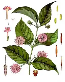 Une Rubiacée, le Nauclea Gambir[7], arbrisseau de l'Indochine et de la Malaisie, fournit les sucs astringents que l'on connaît principalement sous le nom de Gambir, préparés de deux manières :