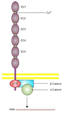 Dans le premier cas elles seront liées en intracellulaire à des caténines. Les caténines vont servir d'intermédiaire de liaison avec le cytosquelette. Les cadhérines sont fixées aux β et γ-caténine, elles-mêmes fixées à α-caténine qui vient se fixer aux filaments d'actine du cytosquelette.