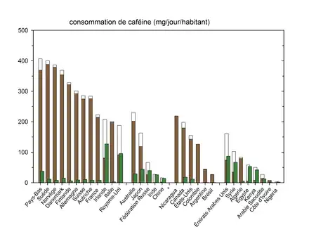 De fait, la caféine est la substance psychoactive la plus consommée au monde ; elle est légale dans tous les pays, à la différence d'autres substances psychoactives. Le profil psychotrope analeptique stimulant de la caféine[20],[21] a été défini par électroencéphalographie quantitative après administration orale d'une dose élevée (400 mg) versus placebo chez des sujets volontaires sains. Elle entraîne de la tachycardie et une stimulation mentale pendant plusieurs heures suivie d'insomnie. En Amérique du Nord, 90 % des adultes consomment de la caféine quotidiennement. La Food and Drug Administration liste la caféine parmi les « substances alimentaires à buts multiples généralement reconnues comme sans danger » aux doses habituelles, mais toxiques au-delà d'une certaine dose.