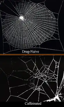 La caféine est un métabolite secondaire présent dans les graines, les feuilles et les fruits de différentes plantes où elle agit comme insecticide naturel[16], paralysant[17] ou tuant les insectes qui les consomment. En revanche, chez les mammifères[18], la caféine agit surtout comme stimulant du système nerveux central et du système cardiovasculaire, diminuant temporairement la somnolence et le temps de réaction et augmentant l'attention.