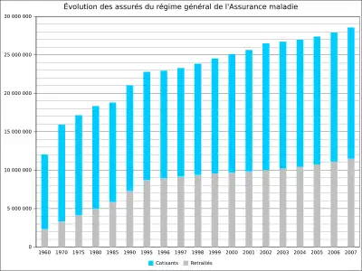 L'Assurance retraite est alors une composante de la Caisse nationale de sécurité sociale (CNSS), qui regroupe aussi l'Assurance maladie et les allocations familiales. Le régime fonctionne par répartition (les cotisations des actifs et des entreprises financent les retraites) et l'âge de la retraite est repoussé, de fait, à 65 ans (jusqu'alors, les personnes couvertes par un régime de retraite pouvaient demander leur retraite à partir de 60 ans)[6]. Le régime ainsi mis en place obéit à une logique d'assurance, mais comporte aussi des prestations non contributives, comme le « minimum vieillesse » et des avantages spécifiques pour les mères de famille.