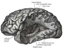 Le terme latin calcar avis (en français littéralement : ergot d'oiseau) désigne une éminence de forme allongée située sur la paroi médiale de la corne postérieure du ventricule latéral. Cette formation est encore appelée hippocampus minor, c'est-à-dire petit hipopocampe ou ergot de Morand, du nom de son découvreur et correspond à l'involution de cette partie de la paroi ventriculaire due au développement de la scissure calcarine du lobe occipital. La description du calcar avis fut donnée pour la première fois par le chirurgien et anatomiste Sauveur-François Morand (1697-1773)[1]: ce dernier « fait part à l'Académie des Sciences, en 1744, de sa découverte d'un relief en cône de coloration blanche qu'il compare à un ergot. Située au-dessous du bulbe, occupant la totalité de la région antéro-postérieure de la corne occipitale, la face externe convexe de l'ergot de Morand bombe dans la cavité du ventricule latéral ».