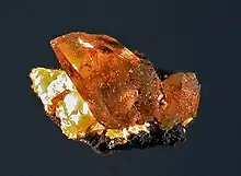 Cristaux de calomel (en jaune) tirés de la mine de Mariposa (Texas). | |