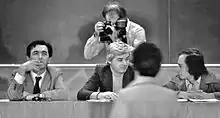 Il reste cependant très actif au sein du Parti québécois et de la politique nationale. Lorsque le gouvernement Bourassa présente le projet de loi 22 qui entend corriger le « Bill 63 », Laurin monte au front avec quelques collègues péquistes afin de dénoncer ce qui apparaît comme des mesures « stériles » qui ne protègent pas le français[54]. Accompagné de René Lévesque et Jacques-Yvan Morin, Camille Laurin propose un « contre-projet de loi[55] » qui propose l’essentiel des mesures que l’on retrouvera, quelques années plus tard, dans la loi 101. La campagne médiatique et le contre-projet n’émeuvent pas le gouvernement libéral qui adopte la loi 22 le .