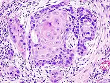 - carcinome épidermoïde (ou spinocellulaire) le plus fréquent ;