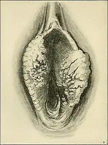 Le cancer de la vulve est une excroissance de tissu maligne et invasive dans la vulve. Cette maladie constitue 0,6 % de tous les diagnostics de cancer[1] ; 5 % de tous les cancers gynécologiques aux États-Unis[2]. La grande lèvre est le site le plus habituel de cette maladie, puisqu'environ 50 % de tous les cas s'y développent, suivie par la petite lèvre[2]. Le clitoris et les glandes de Bartholin sont rarement atteints[3]. Le cancer vulvaire est une maladie distincte de la néoplasie intraépithéliale vulvaire (en) (VIN), une lésion superficielle de l'épithélium qui ne s'est pas propagée dans la membrane basale[4]. La VIN peut toutefois progresser au point de devenir un carcinome in situ, puis des cellules cancéreuses du squame.