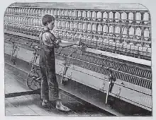 Une paire de machines de 150 pieds (46 m) avec 1 320 broches chacune était conduite par trois ouvriers : le brocheur, le grand et le petit noueur. Le petit noueur débutait sur la machine vers son quatorzième anniversaire, et espérait obtenir un jour le statut de brocheur. Tous ces hommes travaillaient pieds nus, portaient un pantalon blanc en coton léger. Il y avait quatre tâches de base : le garnissage, la levée de fil, le nettoyage et le rattachage des fils cassés (nouage)[4]. Garnissage et nouage devaient être effectués pendant que la machine était en mouvement. Le garnissage consistait à remplacer les bobines dans le râtelier en rattachant l'ancien fil qui venait d'être dévidé avec le nouveau, il était effectué à partir de l'arrière de la machine. Le nouage consistait à rattacher les extrémités des fils qui avaient cassé. Le noueur attrapait l'extrémité cassée au sommet de la bobine de sa main droite et tirait un fil propre pour l'enrouler autour de l'index gauche. Il enfonçait une mèche propre sortant des rouleaux, tirant la main quand les deux brins étaient tordus ensemble. Tout cela était réalisé lors de la marche d'avant en arrière du chariot, le contact étant effectué pendant les trois ou quatre secondes disponibles lorsque le noueur était assez proche pour se pencher sur le cadre et atteindre les rouleaux. À ce moment, le bras et la jambe gauche en avant, son entrejambe était proche de la base des broches[5].