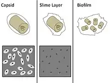 - elles contribuent à la résistance des biofilms, qui protègent les bactéries des UV, des désinfectants médicaux ou domestiques et industriels tels que l'eau de Javel. Néanmoins chez certaines bactéries (ex. : Klebsiella pneumoniae), la présence d'une capsule peut freiner ou inhiber la production de fimbriae[5] et d'adhésines[6]. Les bactéries gram négatif, quand elles sont capsulées semblent moins capables de produire des biofilms, et moins capable d'adhérer aux cellules-cibles de l'hôte[7] ;