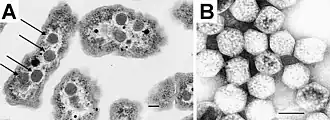[B] Vue de carboxysomes intacts isolés d’H. neapolitanus ; la barre d'échelle indique une longueur de 100 nm[1].