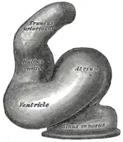 Le tube cardiaque se forme par fusion de la partie interne du mésoblaste ou splanchnopleure puis ce tube se renfle et forme des cavités alignées : oreillette primitive (atrium), le ventricule primitive (ventricle) et le truncus. Au niveau de l'oreillette primitive se trouve le sinus veineux et entre le truncus et le ventricule primitif, il existe un rétrécissement nommé conus (Dans le dessin à droite le troncus et le conus sont nommés bulbus cordis).