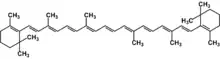 La molécule de β-carotène C40H56 est une chaîne constituée de huit unités isopréniques, avec une série de onze doubles liaisons conjuguées. Elle peut absorber une lumière bleu-indigo et donc apparaître orange comme dans la carotte.